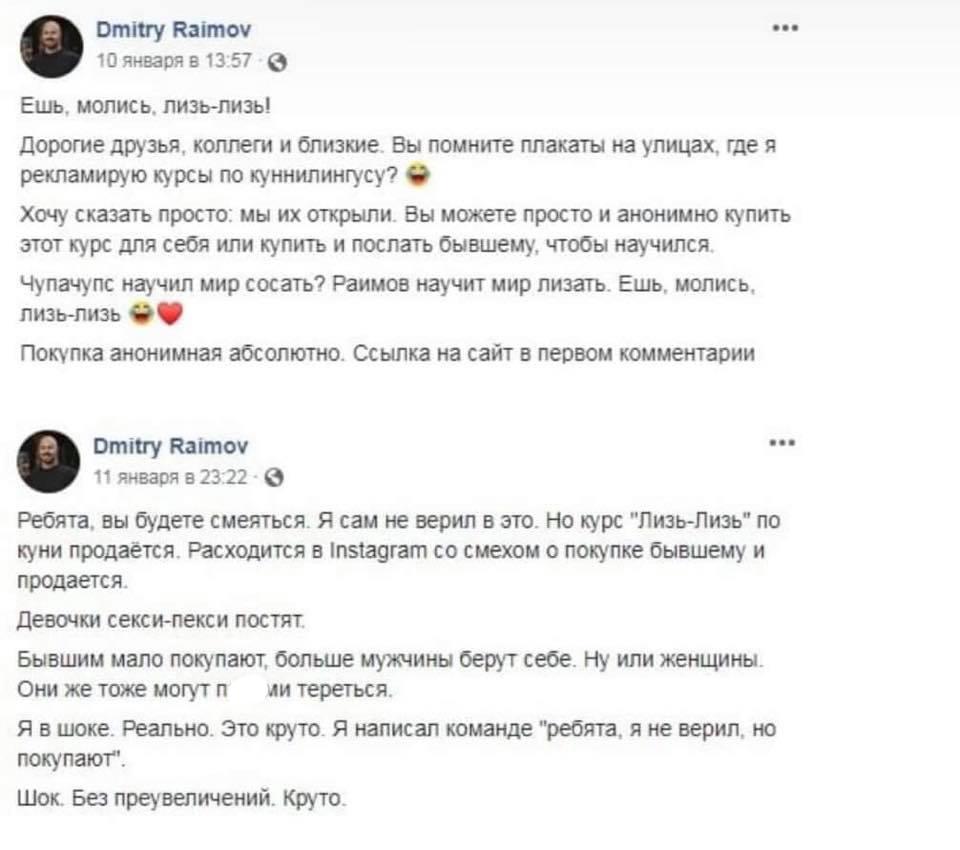 "Советник нового министра здравоохранения Зоряны Скалецкого Дмитрий Раимов ранее рекламировал курсы куннилингуса. "Раимов научит мир лизать" - писал он. Надеемся, в министерстве он будет заниматься все же чем-то другим", - подписан пост в группе.