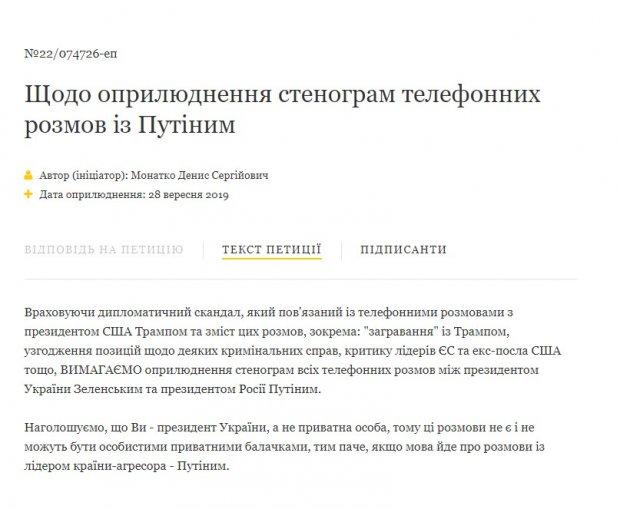 На сайте президента Украины появилось несколько петиций с требованием опубликовать для всеобщего обсуждения стенограммы разговором с российским лидеров Владимиром Путиным.