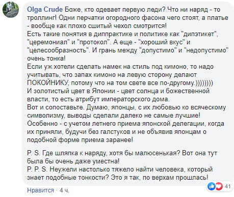 "Боже, кто одевает первую леди? Что ни наряд - то троллинг! Одни перчатки огородного фасона чего стоят, а платье - вообще как плохо сшитый чехол смотрится!"