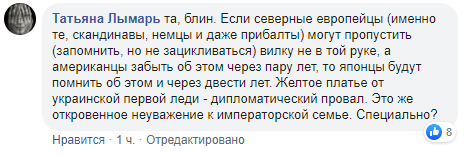 "Желтое платье от украинской первой леди - дипломатический провал. Это же откровенное неуважение к императорской семье. Специально?" - комментируют образ Елены Зеленской пользователи Фейсбука.