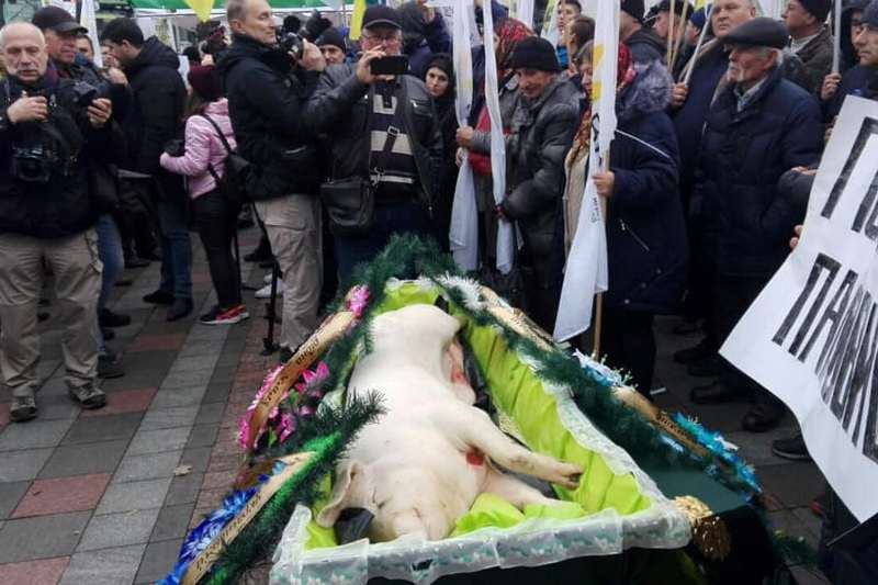 В качестве протеста, участники акции устроили символические похороны туши свиньи, которая повяилась перед Верховной Радой в гробу. По мнеию организаторов, что мертвая свинья олицетворяет будущее украинского животноводства.
