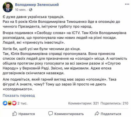 Президент Украины опубликовал в Facebook сообщение, в котором "обличил" Тимошенко.