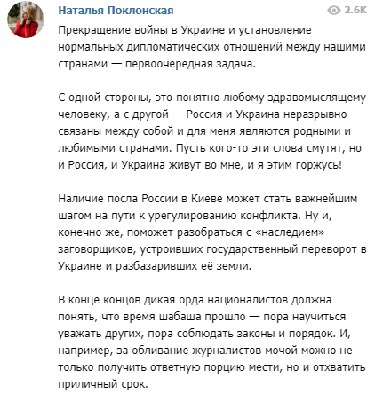 Впоследствии в комментарии "Комсомольской правде" она заявила, что действительно готова стать послом РФ в Украине.