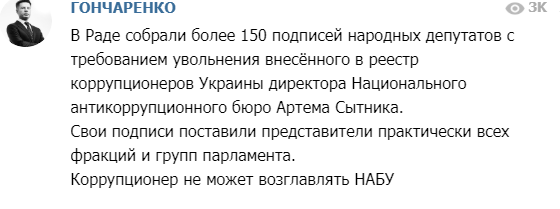 "Свои подписи поставили представители практически всех фракций и групп парламента. Коррупционер не может возглавлять НАБУ", - добавил Гончаренко.