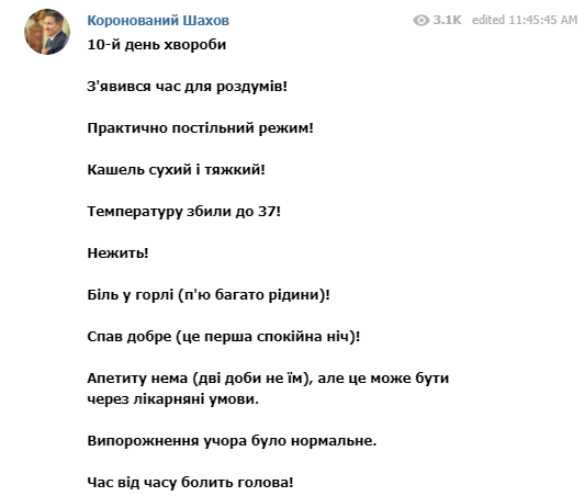 Болезнь продолжается уже 10-й день. В своем Телеграм-канале Шахов рассказал о своих симптомах на данный момент, передает Час Пик.
