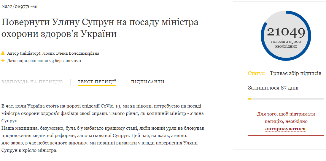 Но сейчас, во время опасного вызова, мы должны требовать у власти возвращения Ульяны Супрун в кресло министра", - сказано в тексте петиции.