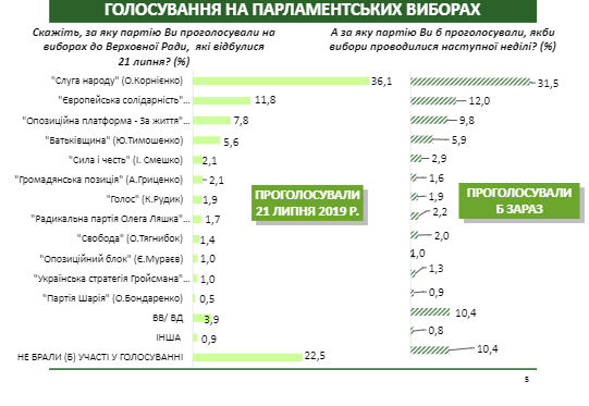Среди политических партий лидером рейтинга остается "Слуга народа", хотя с момента парламентских выборов 21 июля ее поддержка несколько снизилась (с 36,1% до 31,5%).
