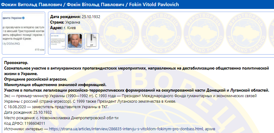 В анкете Фокина на "Миротворце" сказано: