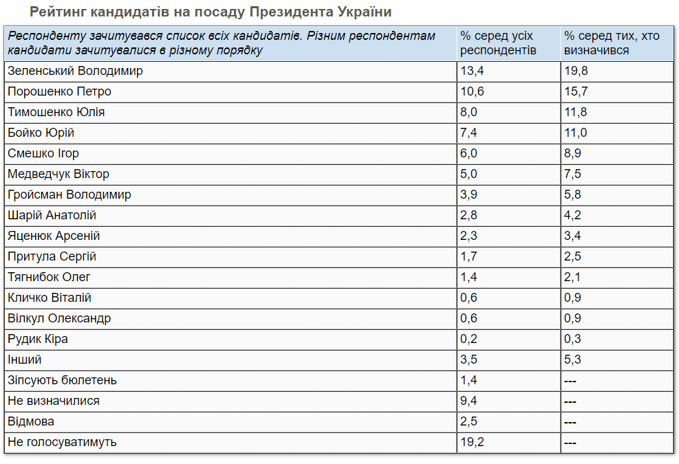 Далее идут Юлия Тимошенко (соответственно, 8% и 11,8%), Юрий Бойко (7,4% и 11%), Игорь Смешко (6% и 8,9%), Виктор Медведчук (5% и 7,5% ), Владимир Гройсман (3,9% и 5,8%).
