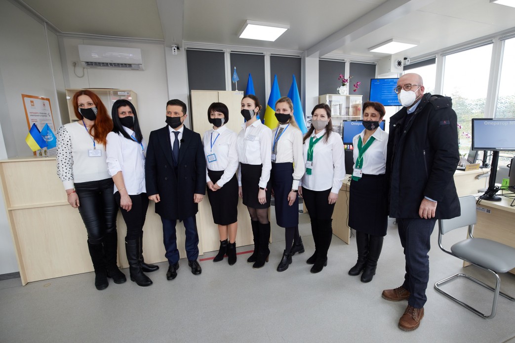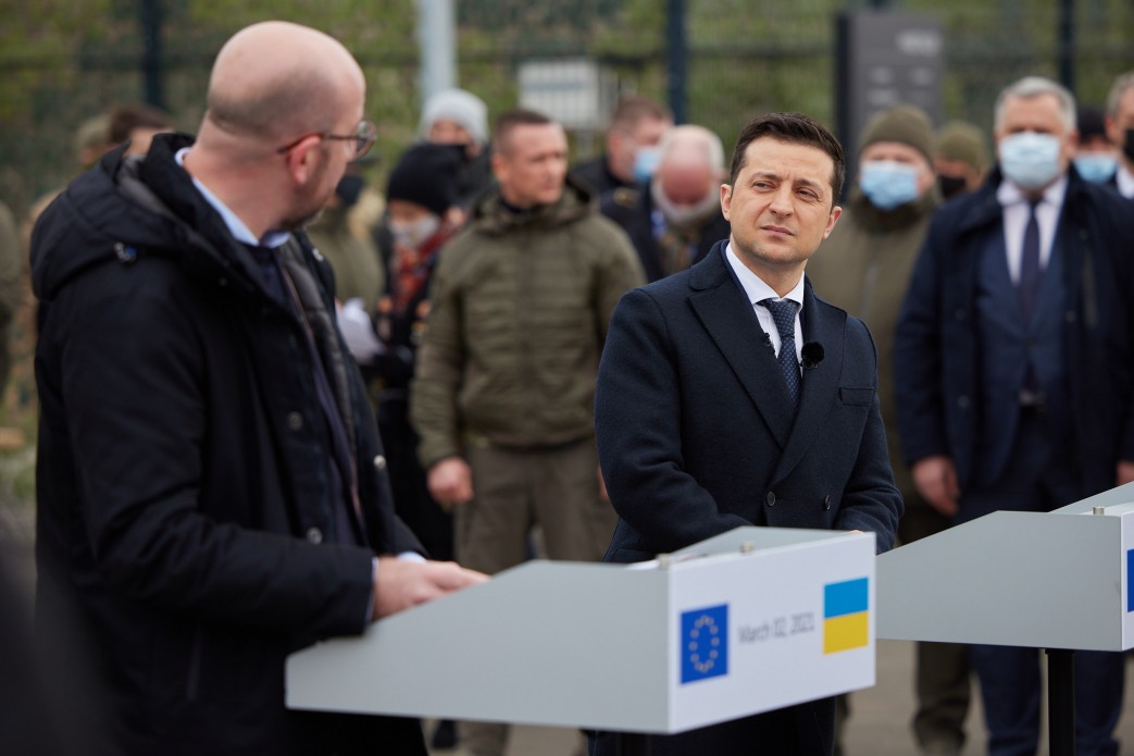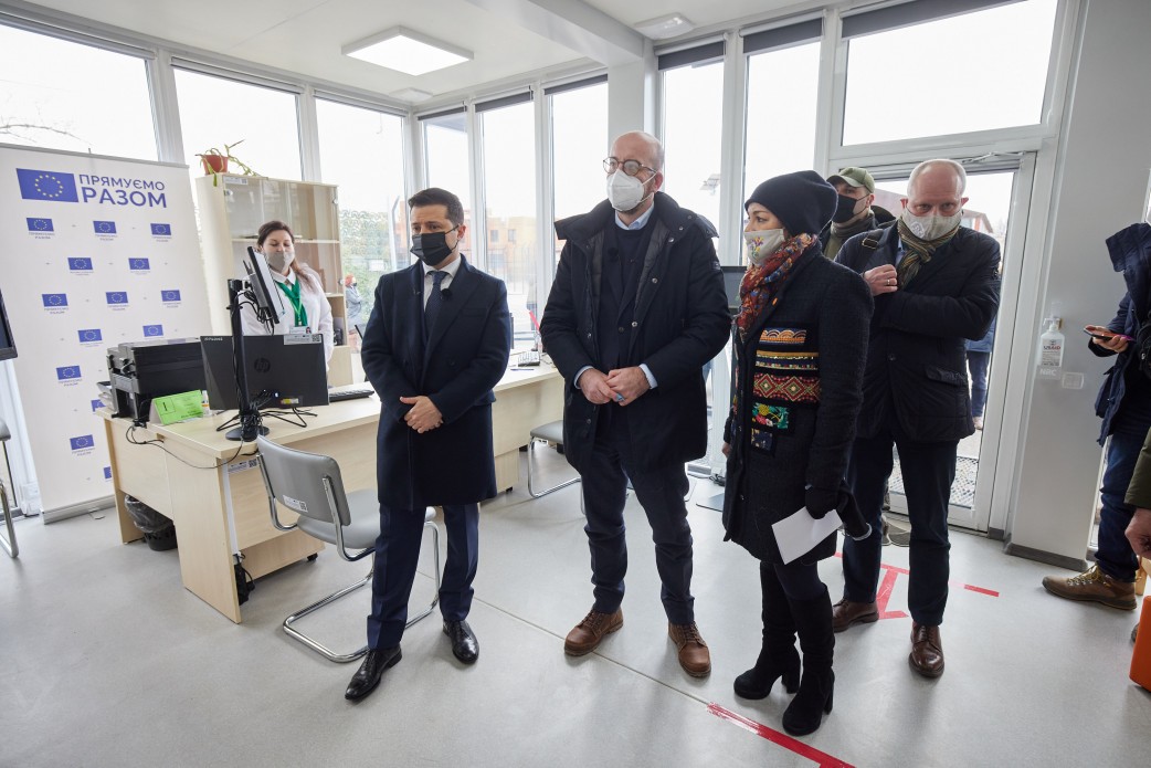 Президент Украины Владимир Зеленский и президент Европейского совета Шарль Мишель осмотрели Центр предоставления административных услуг (ЦПАУ) на контрольном пункте въезда-выезда (КПВВ) «Счастье» в Луганской области.
