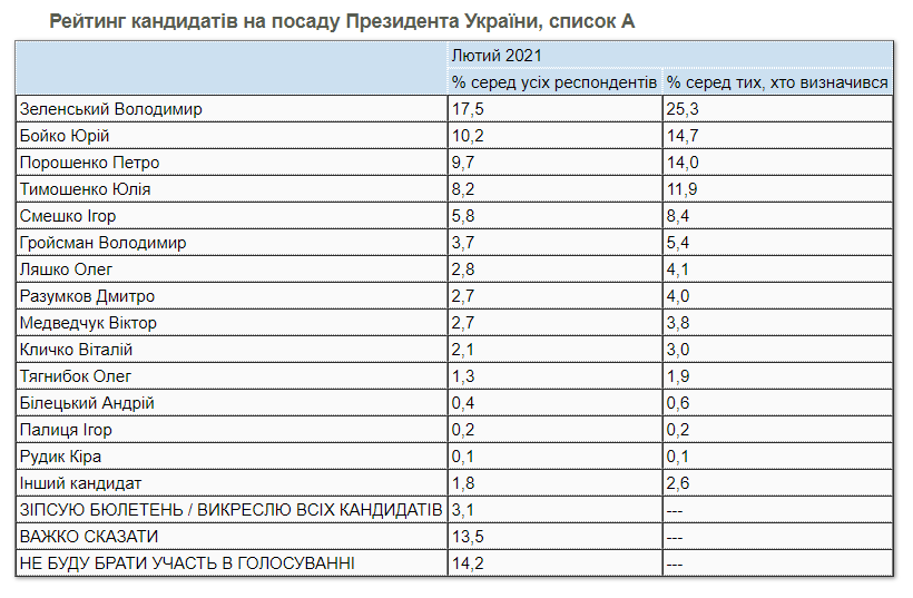 Согласно списку В, в котором нет Медведчука, Зеленский набирает 24% голосов, а разрыв между Бойко и Порошенко увеличивается: 16,7% против 14% соответственно.