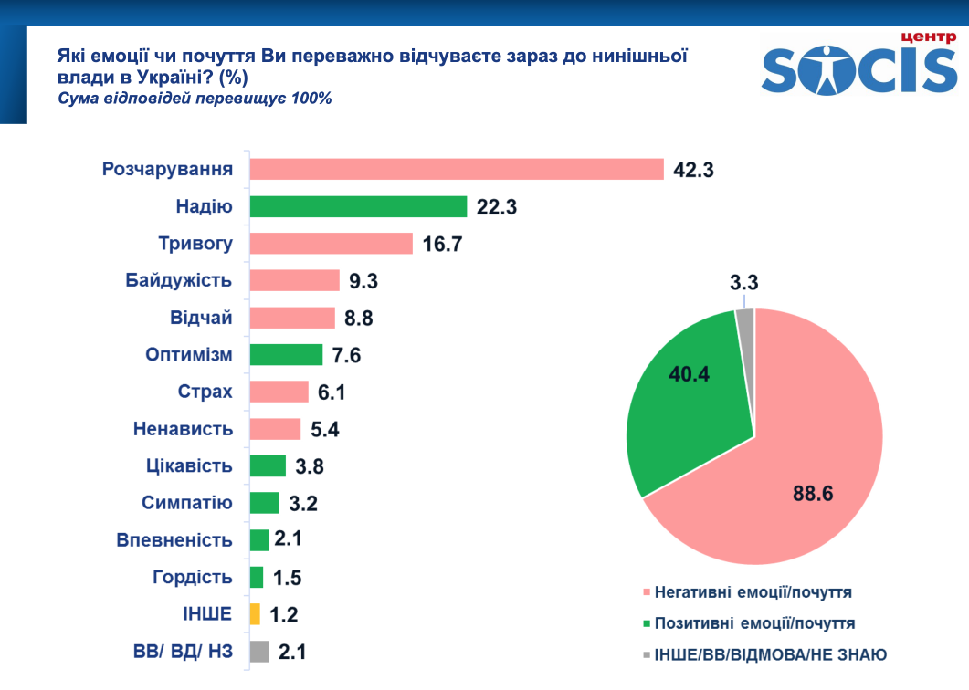 Опрос показал, что нынешняя власть у большей части украинцев (42,3%) ассоциируется с разочарованием, 22,3% смотрят на действия власти с надеждой, 16,7% - с тревогой, 8,8% - с отчаянием.