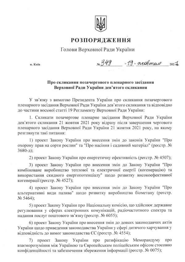 Глава Верховной Рады Украины Руслан Стефанчук подписал распоряжение о созыве 21 октября внеочередного пленарного заседания парламента.