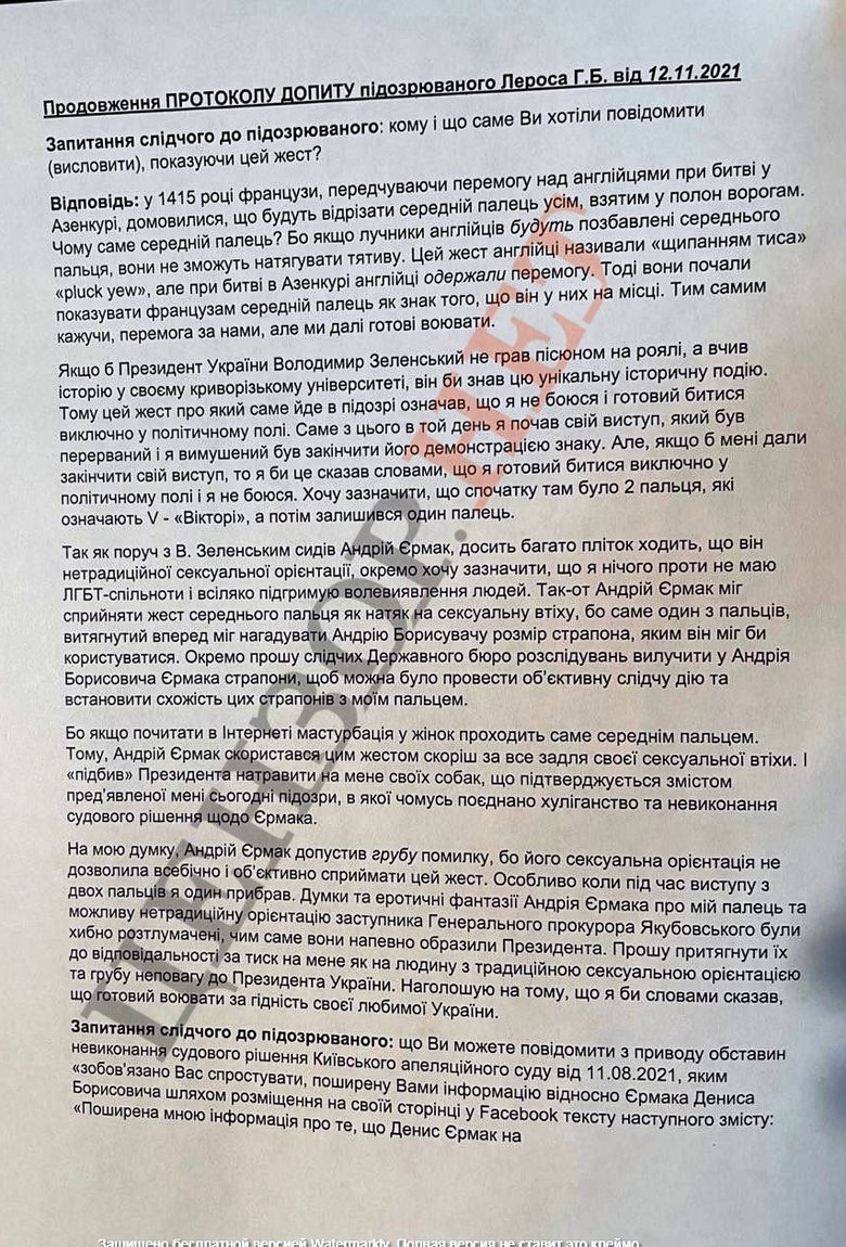 В сети появился фрагмент протокола допроса народного депутата Гео Лероса, которому выдвинули подозрение из-за показанного среднего пальца президенту Владимиру Зеленскому.
