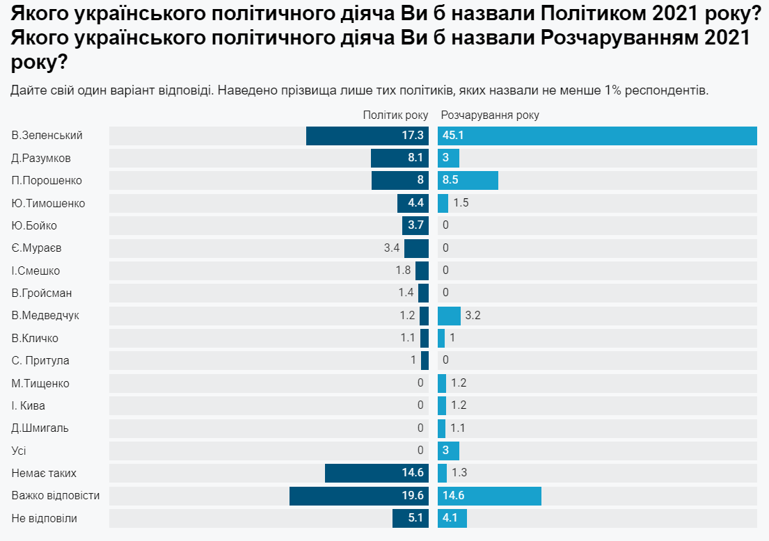 Второе место в номинации "Политик года" делят экс-президент Петр Порошенко (8,1%) и экс-спикер Верховной Рады Дмитрий Разумков (8%). А вот в категории «разочарование года» лидера «Европейской солидарности» Порошенко упоминали чаще (8,5%), чем бывший первый номер списка партии «Слуга народа» Разумкова (3%). Почти 15% опрошенных сказали, что политиком года вообще некого назвать, почти 20% затруднились с ответом, а 5% – не захотели отвечать на этот открытый вопрос.