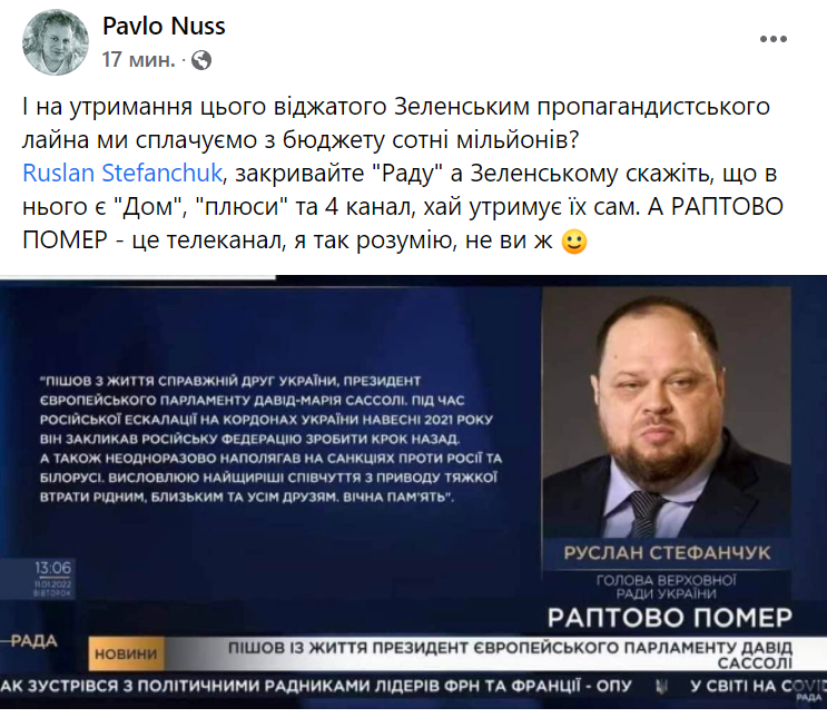 Стефанчук прокомментировал это трагическое событие, но заголовок новости расположили на экране неудачно, и под фото главы Верховной Рады красовалась надпись "Внезапно умер".