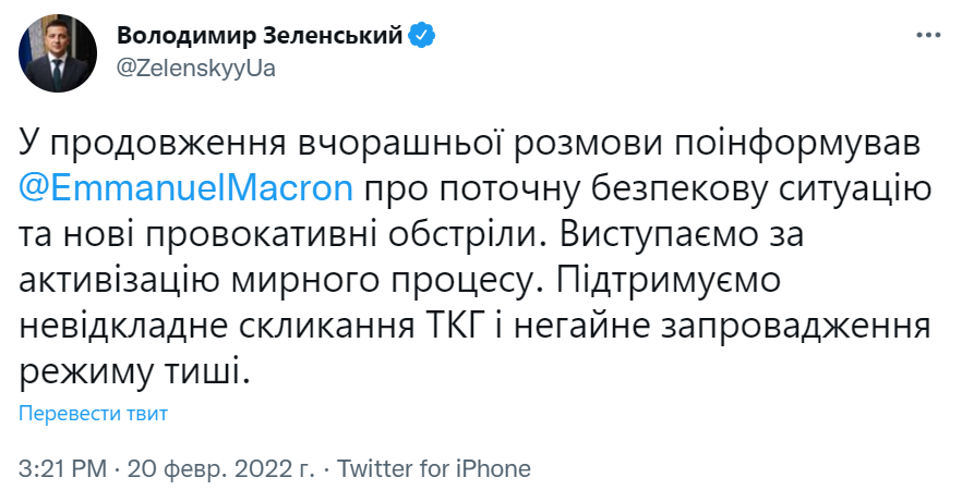 После разговора с Путиным Макрон поговорил с президентом Украины Владимиром Зеленским. В своем Твиттере украинский лидер сообщил, что проинформировал французского коллегу о текущей ситуации с безопасностью и новых провокативных обстрелах на Донбассе.