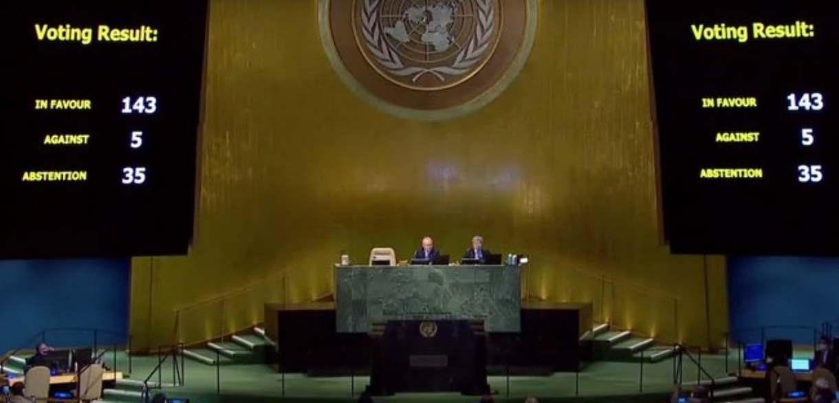 Воздержались 35 стран: Алжир, Армения, Боливия, Бурунди, ЦАР, Китай, Конго, Куба, Эритрея, Эсватини, Эфиопия, Гвинея, Гондурас, Индия, Казахстан, Киргизия, Лаос, Лесото, Мали, Монголия, Мозамбик, Намибия, Пакистан, Южная Африка, Южный Судан, Шри-Ланка, Судан, Таджикистан, Таиланд, Того, Уганда, Танзания, Узбекистан, Вьетнам, Зимбабве.