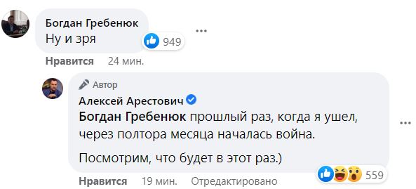 "Прошлый раз, когда я ушел, через полтора месяца началась война. Посмотрим, что будет в этот раз", - написал в комментариях советник ОП.