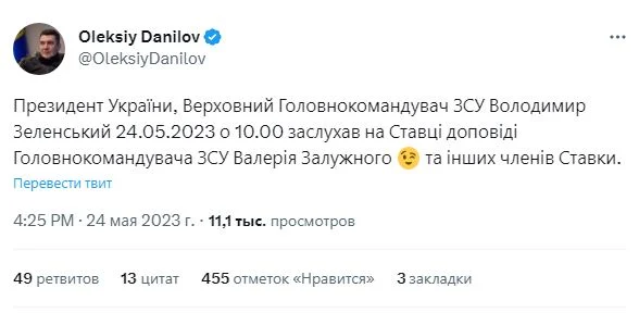 "Президент Украины, Верховный Главнокомандующий ВСУ Владимир Зеленский 24.05.2023 в 10.00 заслушал на Ставке доклады Главнокомандующего ВСУ Валерия Залужного и других членов Ставки", - написал секретарь СНБО.