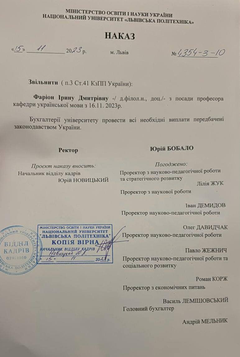 Позже стало известно, что Фарион уволили с должности профессора Львовской политехники. Поводом послужило нарушение 41-й статьи Кодекса законов о труде: совершение работником, выполняющим воспитательные функции, аморального проступка, не совместимого с продолжением этой работы.