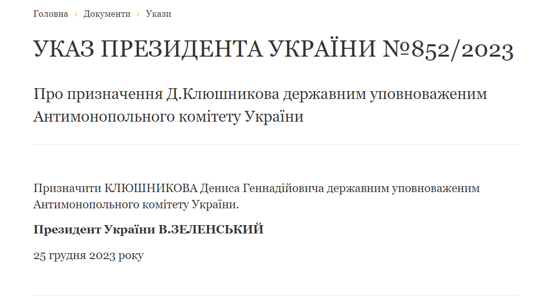 Президент Владимир Зеленский назначил нового государственного уполномоченного Антимонопольного комитета Украины (АМКУ). Им стал Денис Клюшников.