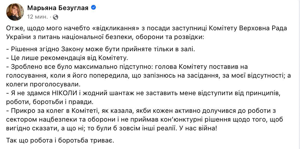 "Госпожа Безуглая не может оставаться на должности заместителя председателя комитета по вопросам национальной безопасности, обороны и разведки. Точка. Зарегистрировал постановление о ее увольнении!", - написал он.