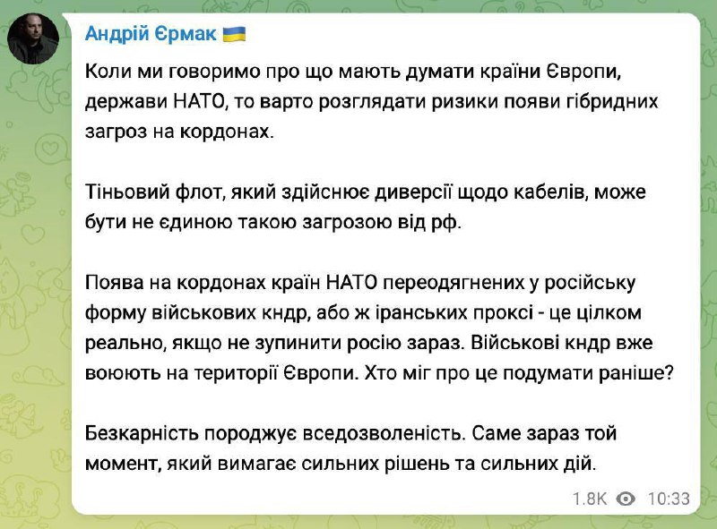 Как отметил Ермак в ТГ-канале, гибридные угрозы, о которых нужно задуматься странам НАТО, могут принять совсем новый оборот, передает Час Пик.