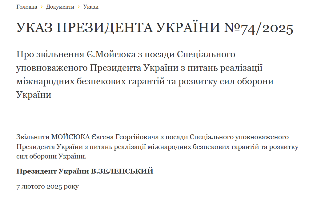 Президент Украины Владимир Зеленский 7 февраля подписал указ об увольнении генерал-лейтенанта Евгения Мойсюка с поста уполномоченного по вопросам гарантий безопасности.