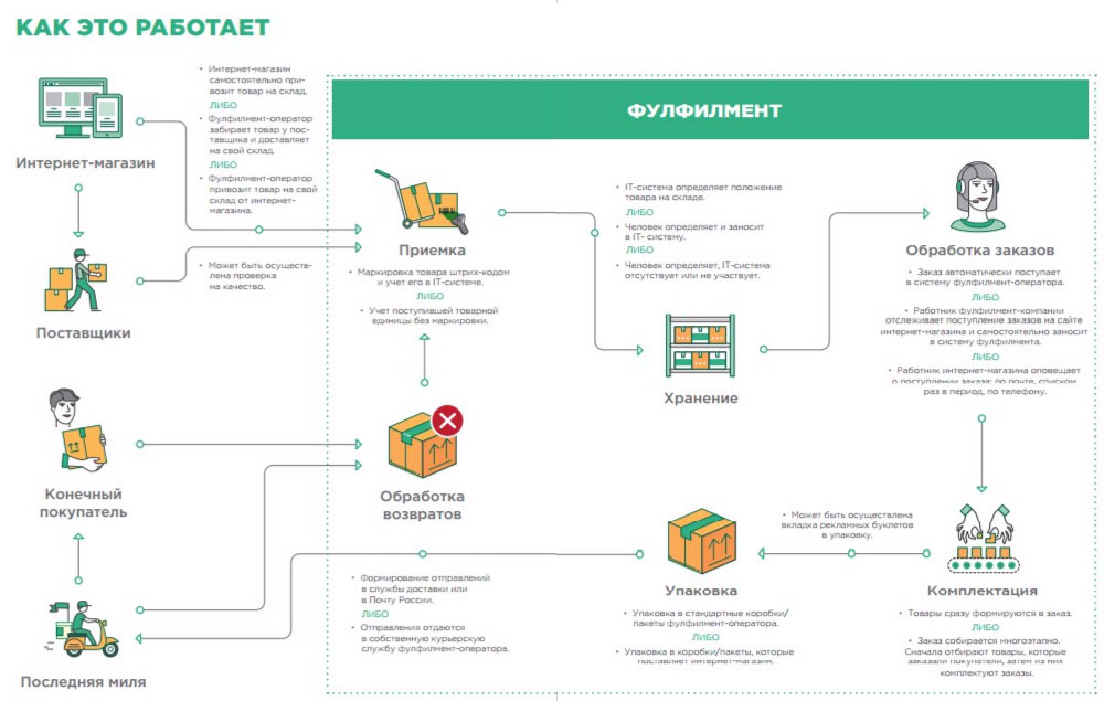 Самый простой вариант такой коллаборации - это когда оператор получает на свой склад готовый к реализации продукт, привезенный логистической службой интернет маркета. После чего такой товар просто перенаправляется клиенту. В данном случае оператор берет на себя задачу обеспечить хранение продукции и ее дальнейшую транспортировку к клиенту.