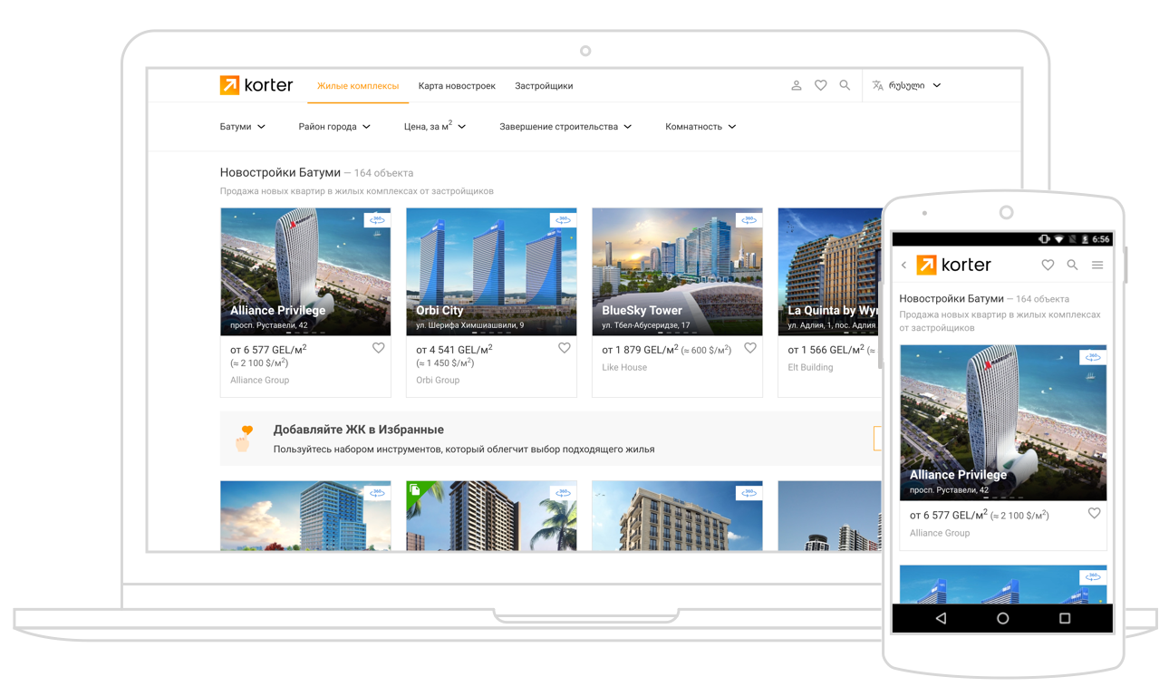 На сегодня Korter ― одна из самых масштабных площадок для поиска недвижимости. Он работает в десяти странах, а с лета 2018 года ― и в Грузии (на базе акселератора недвижимости Flatfy).