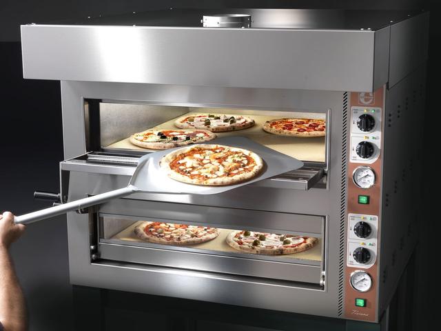 - электропечь – наиболее универсальное и удобное решение. Электрическое профессиональное оборудование для пиццерии не требует специального разрешения, может подключаться к бытовой электросети с рабочим напряжением 220 вольт и имеет различные модификации для разной производительности готовой продукции.
