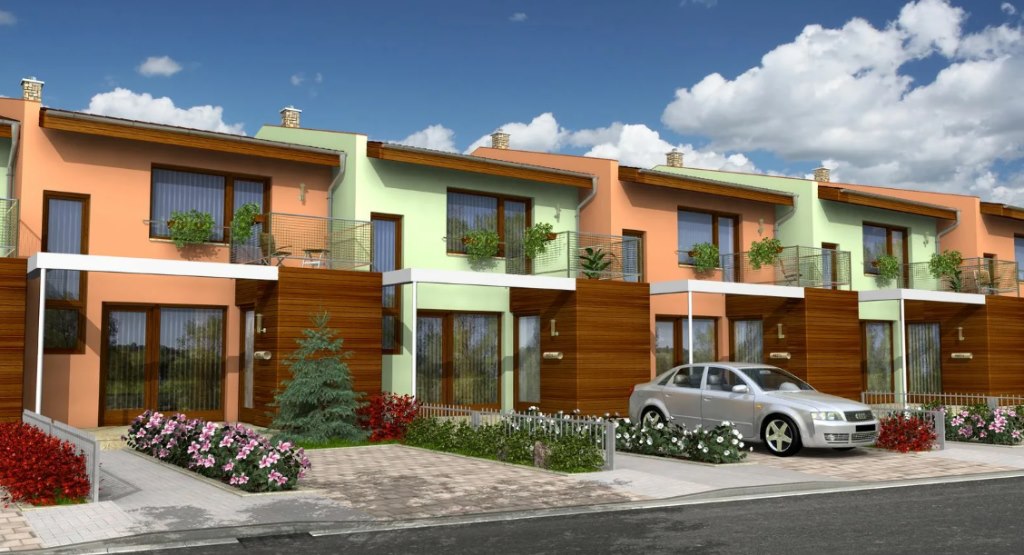 Современный таунхаус представляет собой многоуровневые апартаменты с отдельным входом и небольшим придомовым участком. В отличие от индивидуального коттеджа, таунхаус имеет общие для соседей боковые стены и выглядит частью единого здания, состоящего из апартаментов-блоков.