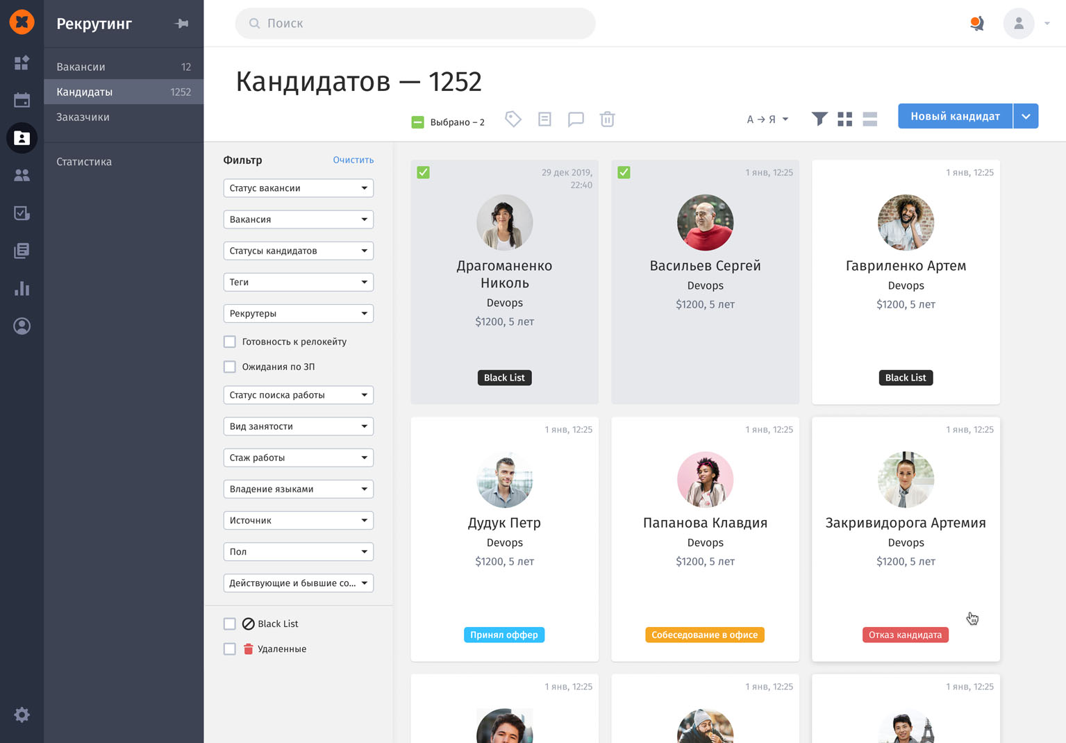 - Общение с кандидатами прямо из системы и др.