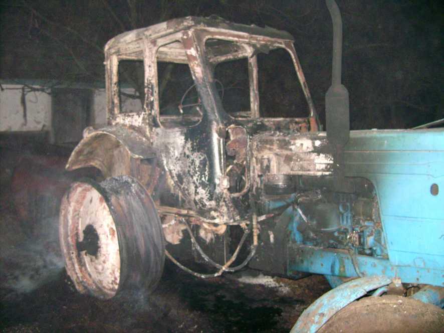 Огонь успел уничтожить кабину трактора МТЗ-50, удостоверение тракториста. Пожарные спасли рядом расположен гараж от уничтожения пламенем.