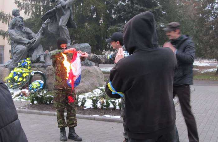 Сегодня, 22 ноября, в городе Дубно Ровенской области после народного вече неизвестные молодчики показательно сожгли российский триколор.