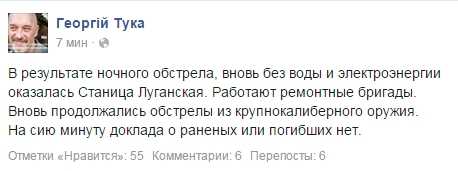 В результате ночного обстрела, вновь без воды и электроэнергии оказалась Станица Луганская. Об этом на своей странице в Фейсбуке написал председатель Луганской ОВГА Георгий Тука.