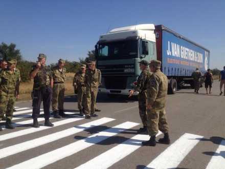 Активисты стоят возле пешеходного перехода и пытаются останавливать грузовики те, что движутся из Крыма. Но обычно они пустые, поэтому их пропускают.