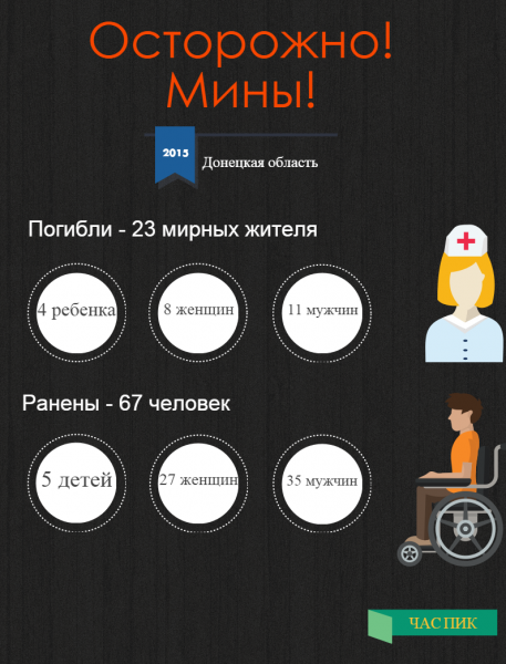 С начала текущего года от подрывов на растяжках, минах и других неизвестных взрывчатых устройствах в Донецкой области погибли 23 мирных жителя. Из них 4 ребенка, 8 женщин и 11 мужчин. Ранено 67 человек (5 детей, 27 женщин и 35 мужчин).