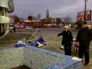 В Николаеве молодчики снова напали на палатку Оппозиционного блока и сбили с ног 66-летнюю женщину.