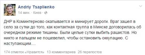 "Враг зашел в село за сутки до того, как контактная группа в Минске договорилась об очередном режиме тишины. Были целые сутки выбить рашистов. Но никто и пальцем не пошевелил, чтобы остановить оккупацию. С наступающим....", - написал журналист.
