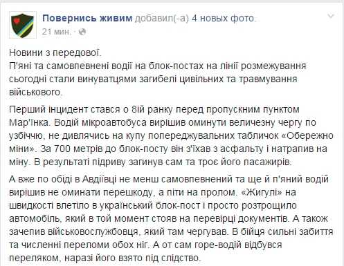 Эту новость Донбасса сообщает Час Пик со ссылкой на информацию, размещенную в Фейсбуке на странице проекта «Повернись живим». Также горе-водитель зацепил военнослужащего, который там дежурил. У бойца сильные ушибы и многочисленные переломы обеих ног. Виновник трагедии не пострадал, сейчас его взяли под следствие.