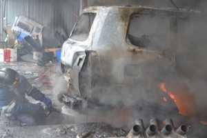 Усилия спасателей были направлены, в первую очередь, на эвакуацию 2 автомобилей которые находились рядом в помещении и одновременно на прекращение распространения огня и защиту здания в целом.