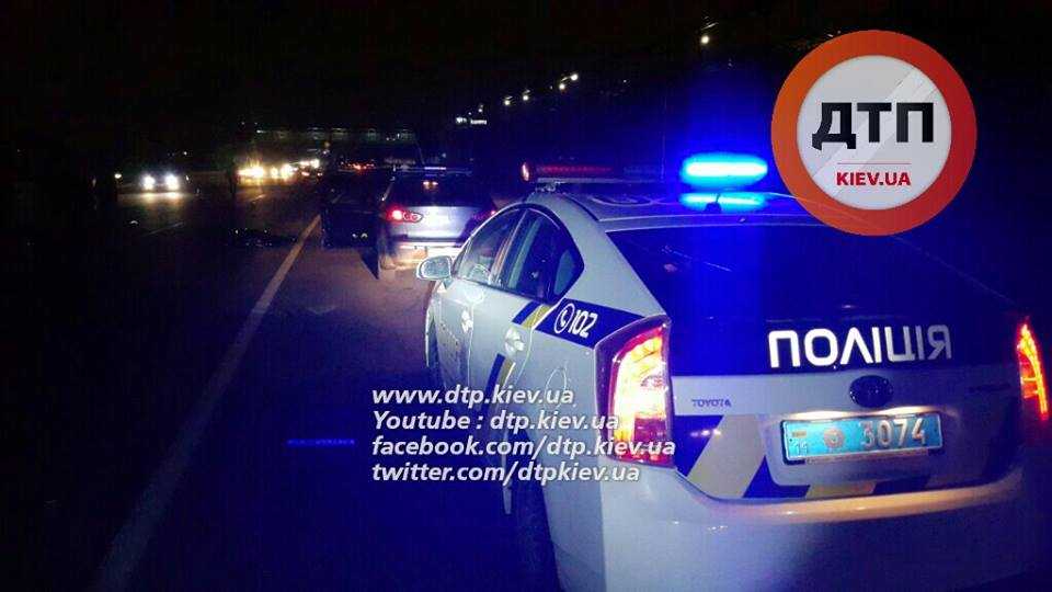 В Киеве у Дарницкого моста произошло смертельное ДТП. На темной дороге водитель Лексус насмерть сбил пешехода, который с пакетом продуктов перебегал 8 полос.