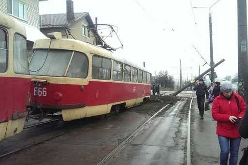 В Харькове произошла авария с участием трамвая. Около 8:00 на перекрестке проспекта Тракторостроителей и улицы Амосова сошел с рельсов трамвай. При этом он сбил опору контактной сети.