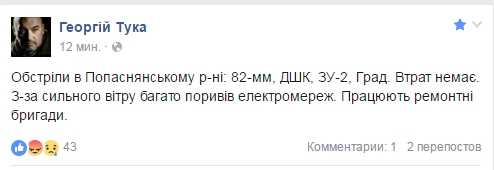 "Обстрелы в Попаснянском р-не: 82-мм, ДШК, ЗУ-2, Град. Потерь нет. Из-за сильного ветра много порывов электросетей. Работают ремонтные бригады", - написал Тука.
