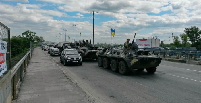 В колонне были замечены несколько БТРов, а также грузовики с личным составом одного из подразделений Вооруженных сил Украины.