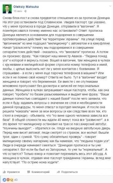 Украинский журналист Алексей Мацука рассказал в Фейсбуке о том, что его задержали на блокпосту из-за донецкой прописки.