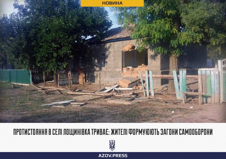 "Сегодня в понедельник, 29-го августа, в село приехали лидеры цыганских криминальных группировок, которых жители Лощиновки назвали «цыганскими баронами». Эти люди стали угрожать физической расправой жителям села и заявили о своей готовности отстаивать право «поступать как им заблагорассудится». Также в своих угрозах так называемые «цыганские бароны» вспомнили, что цыгане сейчас «перегруппировывается в Измаиле» и «не собираются покидать населенный пункт». Очевидцами угроз стали активисты Одесского отделения Гражданского Корпуса «Азов». На данный момент активисты помогают местным жителям развивать силы самообороны, инициаторами которой стали мужчины из села, на случай исполнения угроз со стороны этнической мафии.