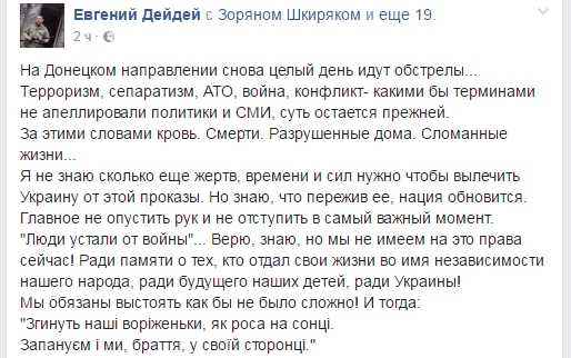 "Люди устали от войны"... Верю, знаю, но мы не имеем на это права сейчас! Ради памяти о тех, кто отдал свои жизни во имя независимости нашего народа, ради будущего наших детей, ради Украины!